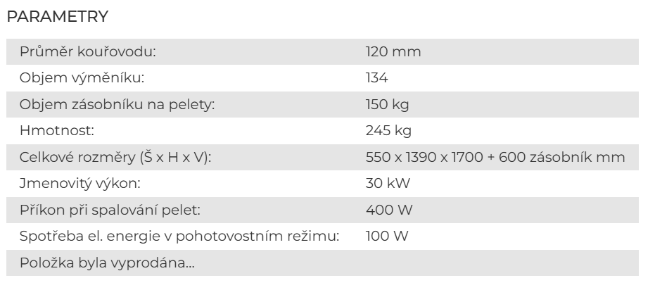 | Spotřeba pelet při maximálním výkonu | max 6 kg/h |