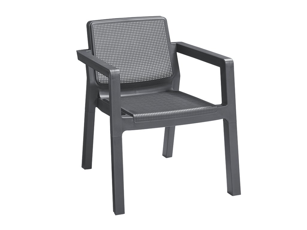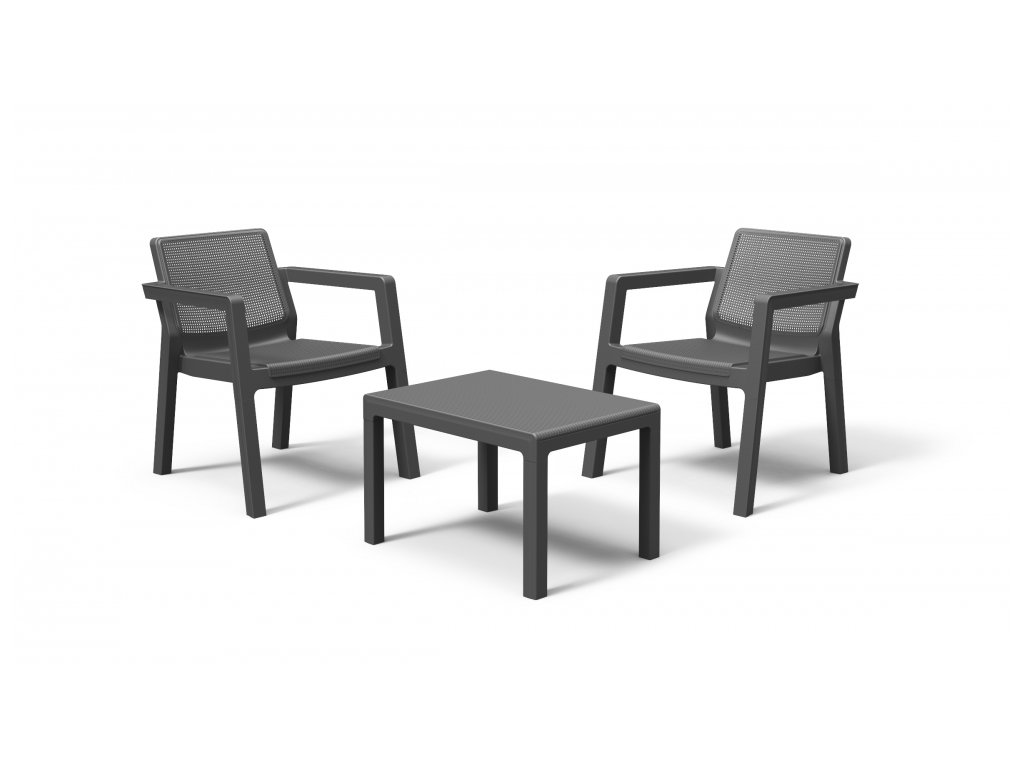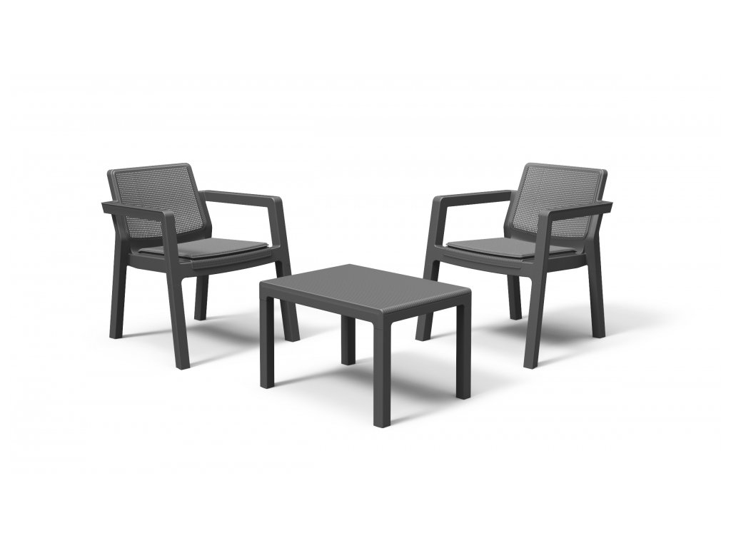 Balkónový set Emily vás nadchne svým estetickým designem a elegantní povrchovou úpravou v grafitové barvě. Její pevná konstrukce velmi dobře odolává vlivům počasí a slunečnímu záření, takže lze set ponechat venku bez obav. Dvě křesla a stolek se na vaší terase, balkónu či zahradě budou náramně vyjímat. Montáž je velmi snadná - není potřeba žádného nářadí a netrvá déle než 5 minut.