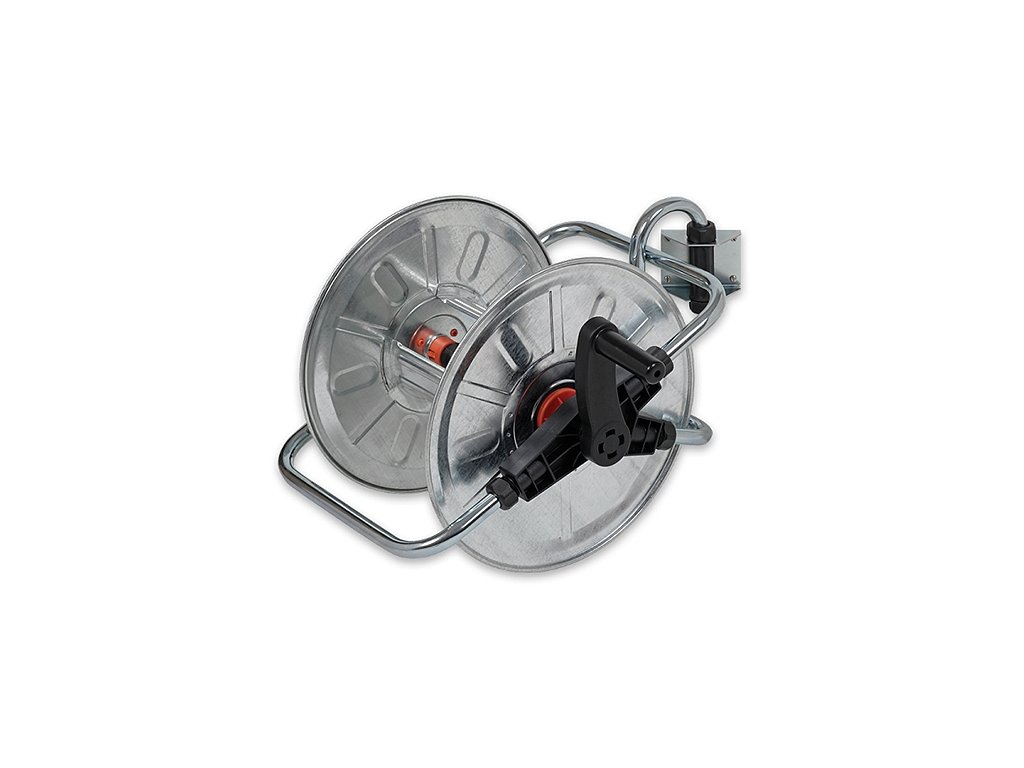 Kovový nástěnný navíjecí buben pro zahradní hadici 1/2" 50m. Díky upevnění na otočném kloubu se při navýjení a odvíjení hadice zabraňuje jejímu překruconání.