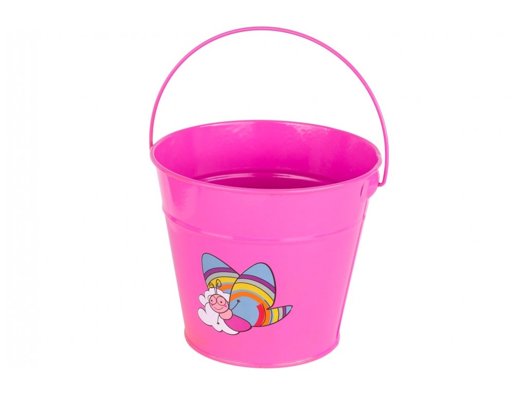 Dětský plechový kbelík růžové barvy s motýlem; ideální na hraní na písku nebo na zahradě.
