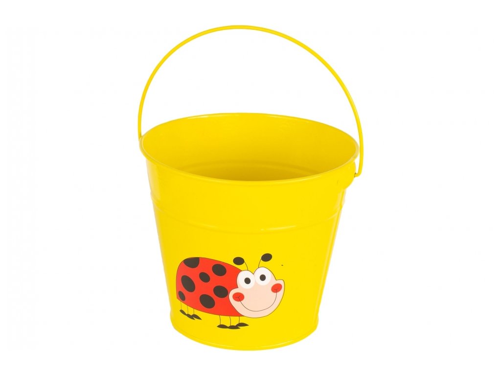 Dětský plechový kbelík žluté barvy s beruškou; ideální na hraní na písku nebo na zahradě.