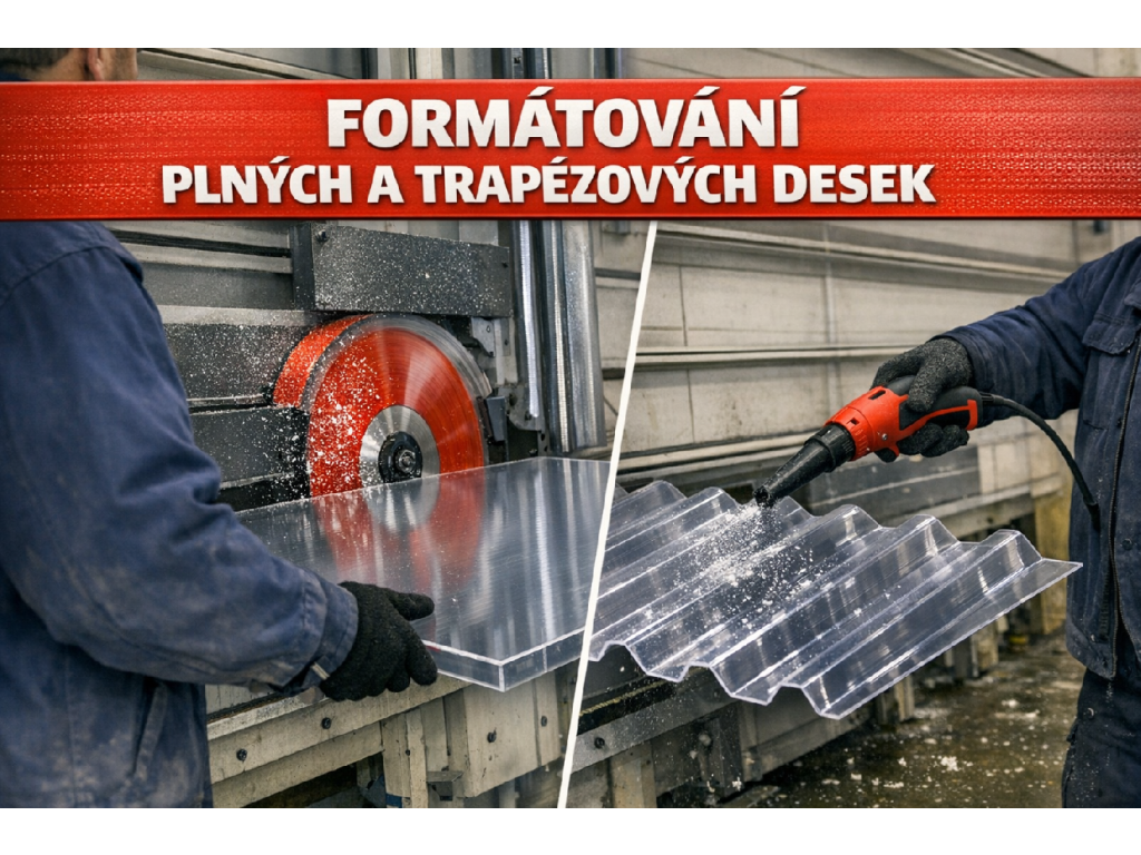 Plné polykarbonátové desky a plexisklo – tento typ materiálu formátujeme od tloušťky 2 do 25 mm. Dělení slabších nebo silnějších desek zajistíme po dohodě u externího zpracovatele. Desky s délkou větší než 3050mm neformátujeme.