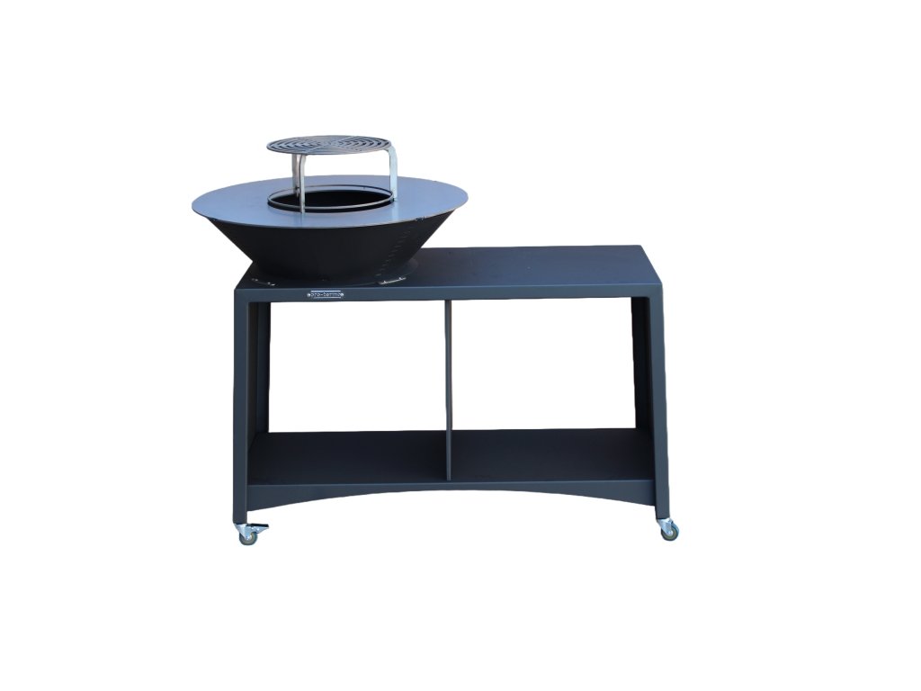 Velké zahradní ohniště s podstavcem vyrobeným z pevné oceli ošetřené žáruvzdorným povrchem. Ohniště je doplněno bočním odkládacím prostorem a rozšířeným úložným prostorem na dřevo.