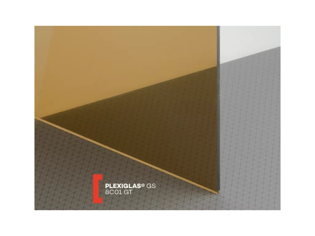 Průhledné hnědě kouřové lité plexisklo tloušťky 5 mm Plexiglas GS 8C01 s propustností světla cca 16%. Jedná se o velmi kvalitní druh plexiskla, materiál je vysoce odolný proti UV záření a povětrnostním vlivům. Obě povrchové strany těchto desek z plexiskla jsou hladké a vysoce lesklé, dodávané s ochrannou folií. Široké použití v reklamě, stavebnictví a průmyslu. Výroba litím znamená, že materiál se naleje mezi dvě skleněné desky a v peci postupně chládne. Tímto získává menší vnitřní pnutí, avšak větší tloušťkovou toleranci než extrudované plexisklo.