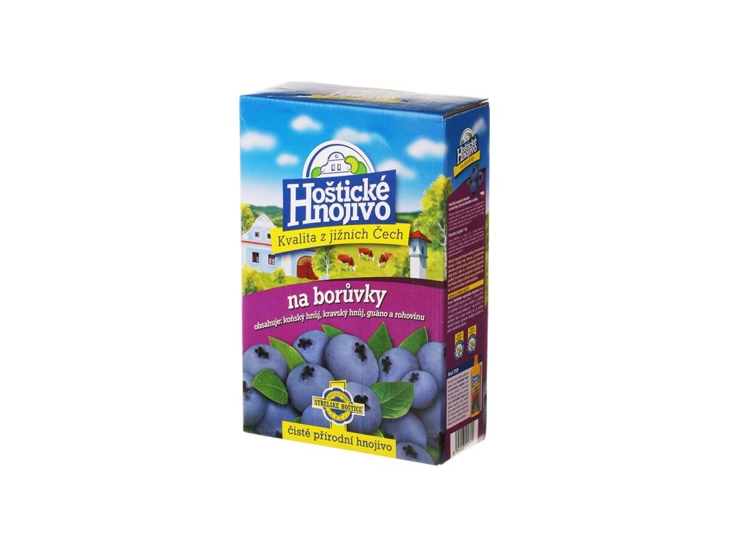 Hoštické organické hnojivo na borůvky a jiné kyselomilné rostliny obsahuje fermentovaný kravský a koňský hnůj, drcenou a granulovanou rohovinu a přírodní guáno, pocházející z trusu mořských ptáků. Jedná se o čistě přírodní produkt, bez přídavku průmyslově vyráběných složek. Hnojivo dodává nejen potřebné živiny, ale výrazně aktivuje i půdní mikroflóru.