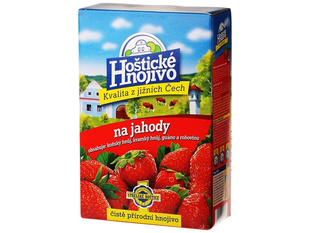 Hoštické organické hnojivo na jahody obsahuje fermentovaný kravský a koňský hnůj, drcenou a granulovanou rohovinu a přírodní guáno, pocházející z trusu mořských ptáků. Jedná se o čistě přírodní produkt, bez přídavku průmyslově vyráběných složek. Hnojivo dodává nejen potřebné živiny, ale výrazně aktivuje i půdní mikroflóru.