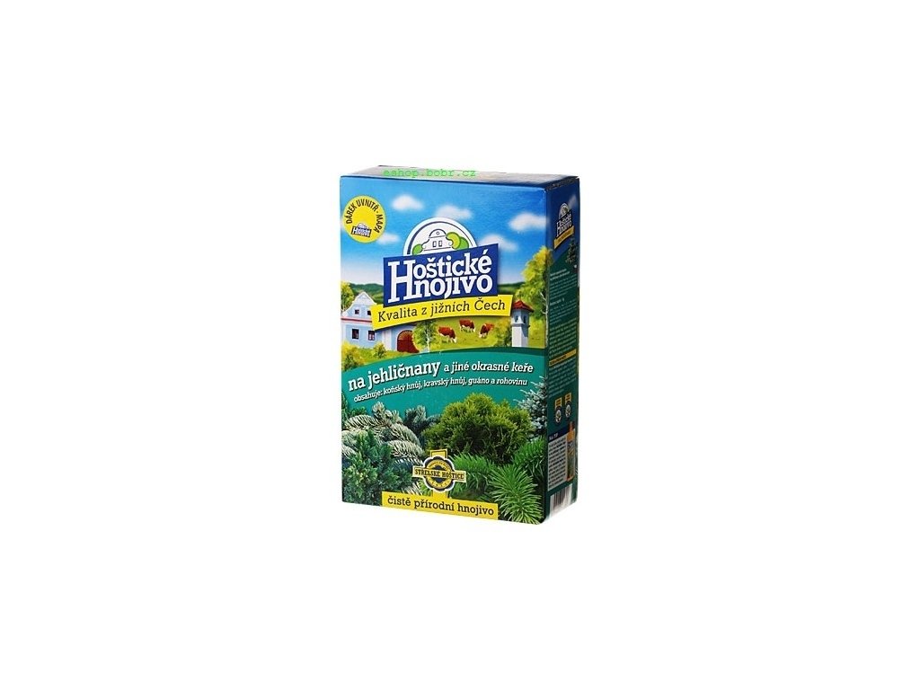 Hoštické organické hnojivo na jehličnany a jiné okrasné keře obsahuje fermentovaný kravský a koňský hnůj, drcenou a granulovanou rohovinu a přírodní guáno, pocházející z trusu mořských ptáků. Jedná se o čistě přírodní produkt, bez přídavku průmyslově vyráběných složek. Hnojivo dodává nejen potřebné živiny, ale výrazně aktivuje i půdní mikroflóru.