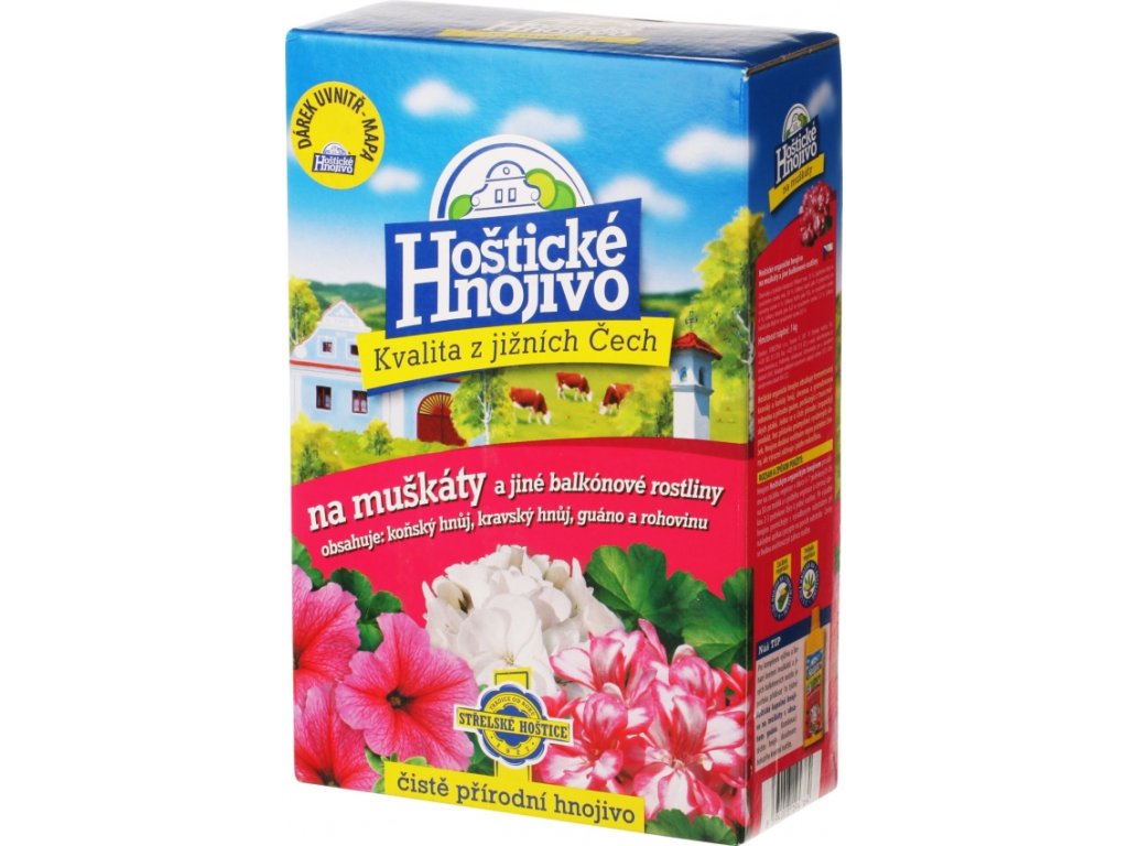 Hoštické organické hnojivo na muškáty a jiné balkónové rostliny obsahuje fermentovaný kravský a koňský hnůj, drcenou a granulovanou rohovinu a přírodní guáno, pocházející z trusu mořských ptáků. Jedná se o čistě přírodní produkt, bez přídavku průmyslově vyráběných složek. Hnojivo dodává nejen potřebné živiny, ale výrazně aktivuje i půdní mikroflóru.