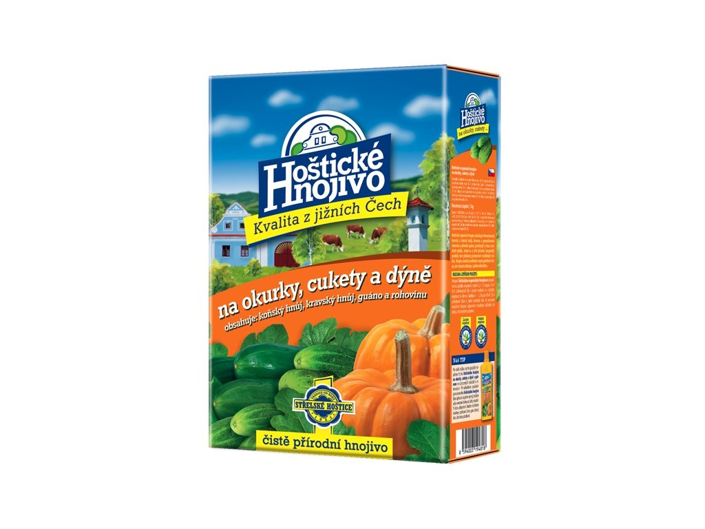 Hoštické organické hnojivo na okurky, cukety a dýně obsahuje fermentovaný kravský a koňský hnůj, drcenou a granulovanou rohovinu a přírodní guáno, pocházející z trusu mořských ptáků. Jedná se o čistě přírodní produkt, bez přídavku průmyslově vyráběných složek. Hnojivo dodává nejen potřebné živiny, ale výrazně aktivuje i půdní mikroflóru.