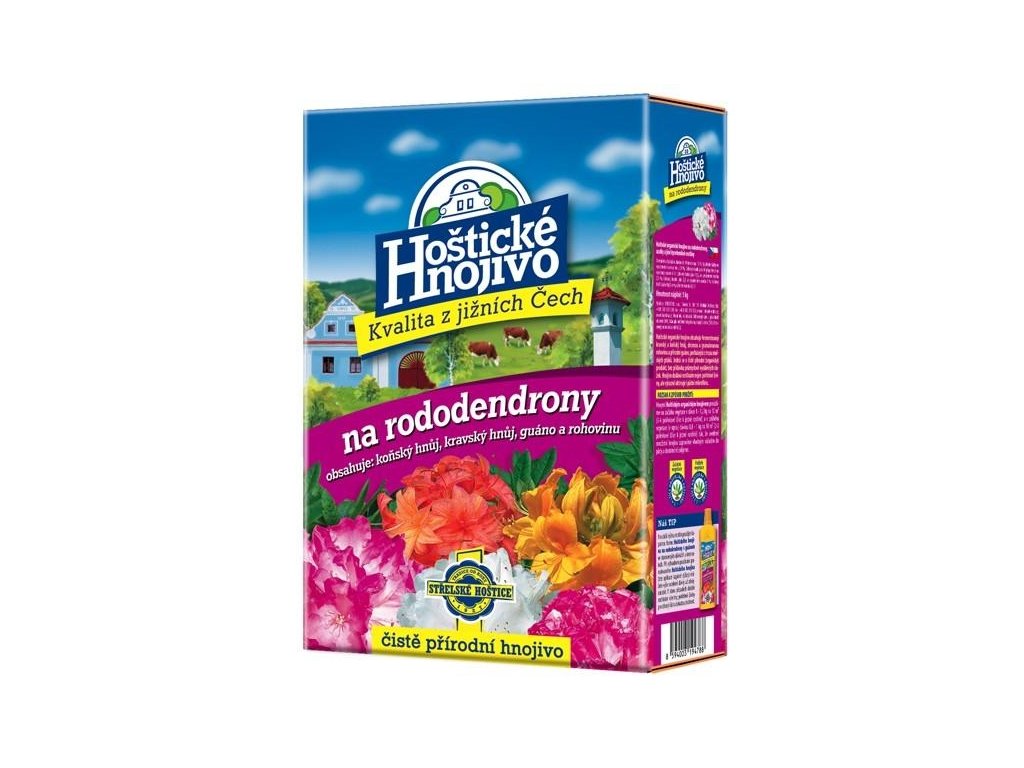 Hoštické organické hnojivo na rododendrony obsahuje fermentovaný kravský a koňský hnůj, drcenou a granulovanou rohovinu a přírodní guáno, pocházející z trusu mořských ptáků. Jedná se o čistě přírodní produkt, bez přídavku průmyslově vyráběných složek. Hnojivo dodává nejen potřebné živiny, ale výrazně aktivuje i půdní mikroflóru.