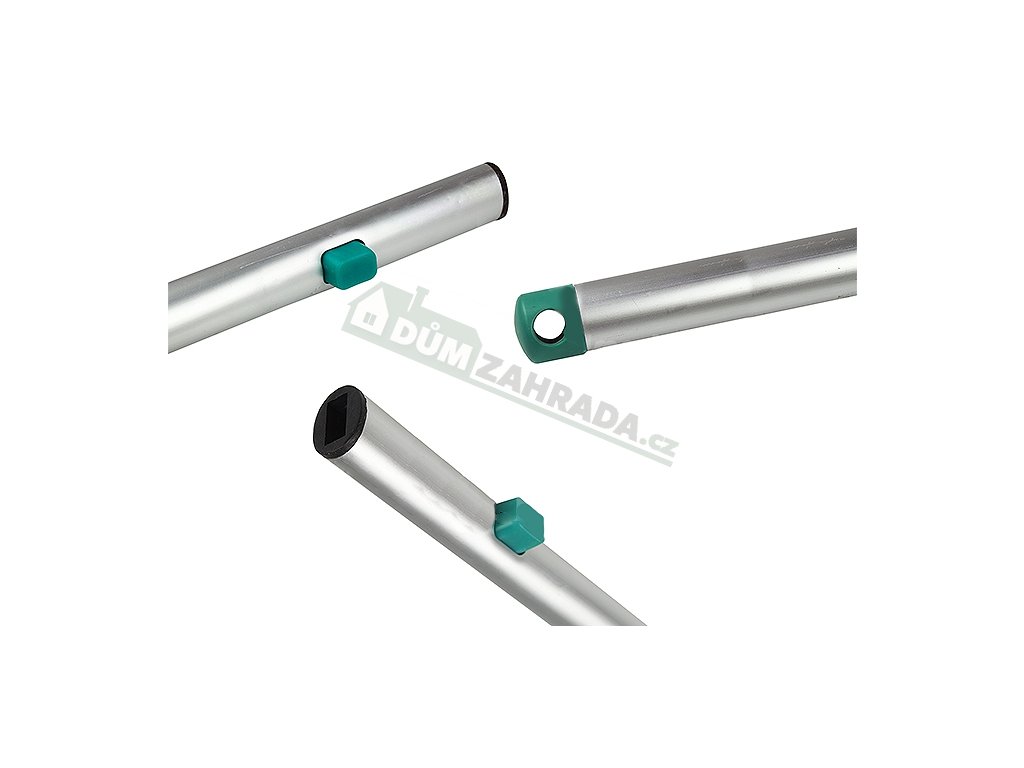 různých druhů zahradního nářadí. Jednoduchým způsobem za pomocí tlačítka lze nástavec na násadě vyměnit. Spojení násady a