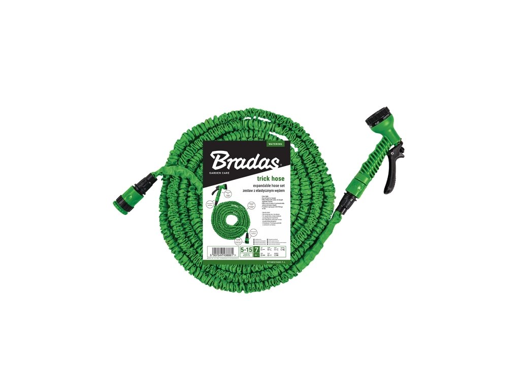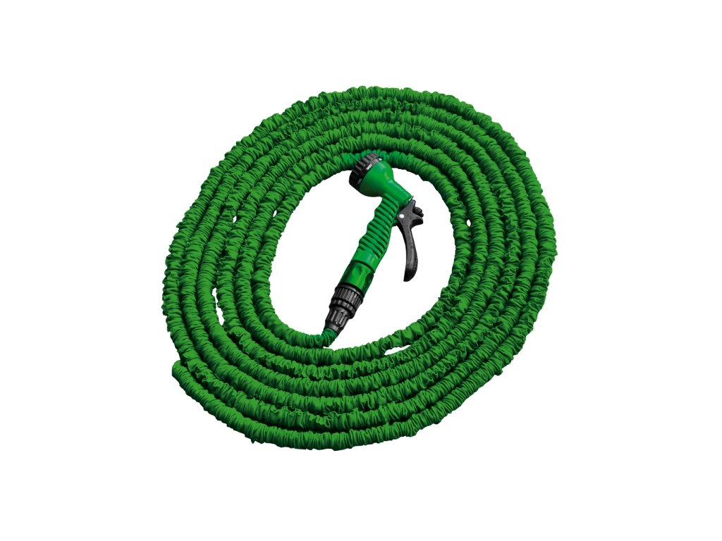 Revoluční zahradní zalévací komplet TRICK HOSE 10-30 m zelený - flexibilní a lehká hadice. Po naplnění vodou zvětší svůj objem na trojnásobek své délky. Po uzavření přívodu vody se opět vrátí do původního rozměru a proto je velice skladná a praktická. Komplet je dodáván včetně připojky ke zdroji vody a postřikovací pistolí se 7 funkcemi a sadou šroubení.