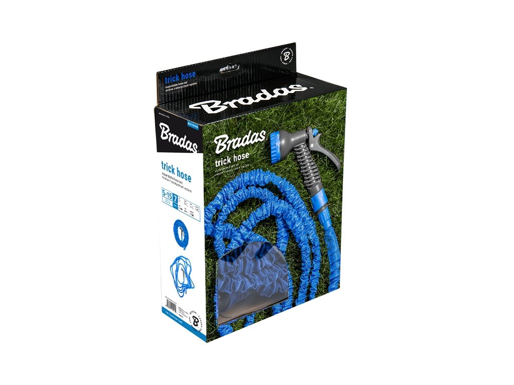 Revoluční zahradní zalévací komplet TRICK HOSE 5-15m modrý - flexibilní a lehká hadice. Po naplnění vodou zvětší svůj objem na trojnásobek své délky. Po uzavření přívodu vody se opět vrátí do původního rozměru a proto je velice skladná a praktická. Komplet je dodáván včetně připojky ke zdroji vody a postřikovací pistolí se 7 funkcemi. Hadici je možné používat do tlaku vody 4 BAR.