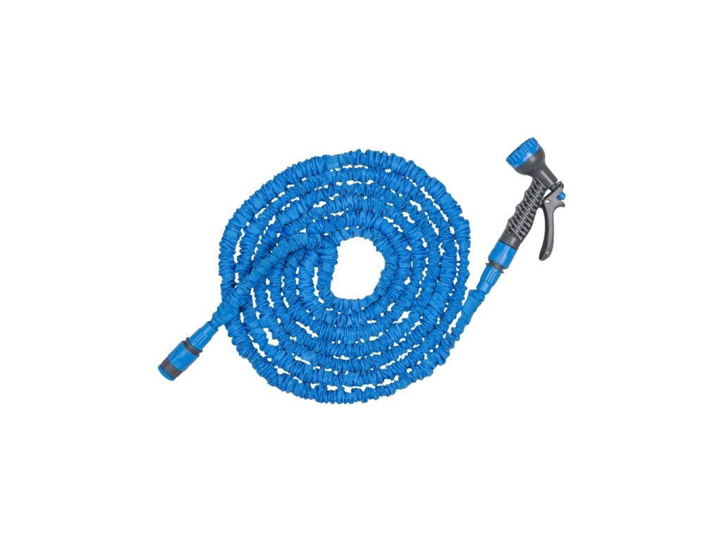 Revoluční zahradní zalévací komplet TRICK HOSE 5-15m modrý - flexibilní a lehká hadice. Po naplnění vodou zvětší svůj objem na trojnásobek své délky. Po uzavření přívodu vody se opět vrátí do původního rozměru a proto je velice skladná a praktická.
