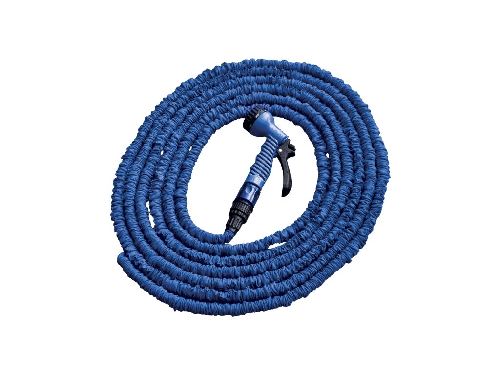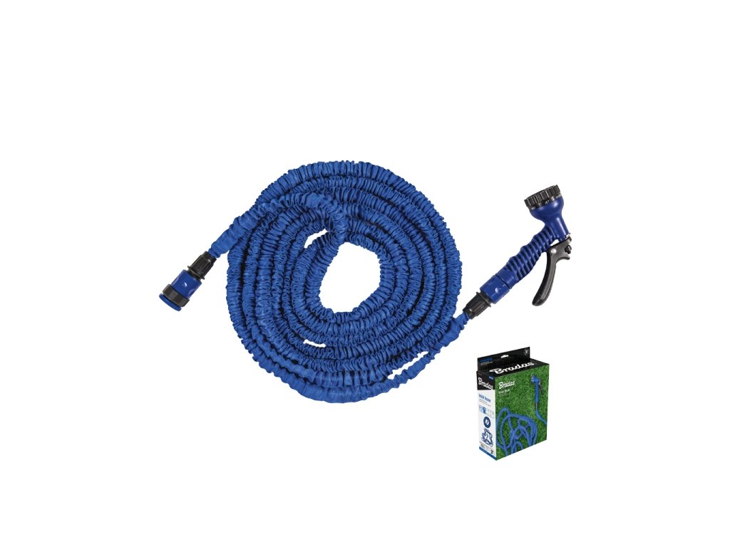 Revoluční zahradní zalévací komplet TRICK HOSE 7-22 m modrý - flexibilní a lehká hadice. Po naplnění vodou zvětší svůj objem na trojnásobek své délky. Po uzavření přívodu vody se opět vrátí do původního rozměru a proto je velice skladná a praktická. Komplet je dodáván včetně připojky ke zdroji vody a postřikovací pistolí se 7 funkcemi. Hadici je možné používat do tlaku vody 4 BAR.