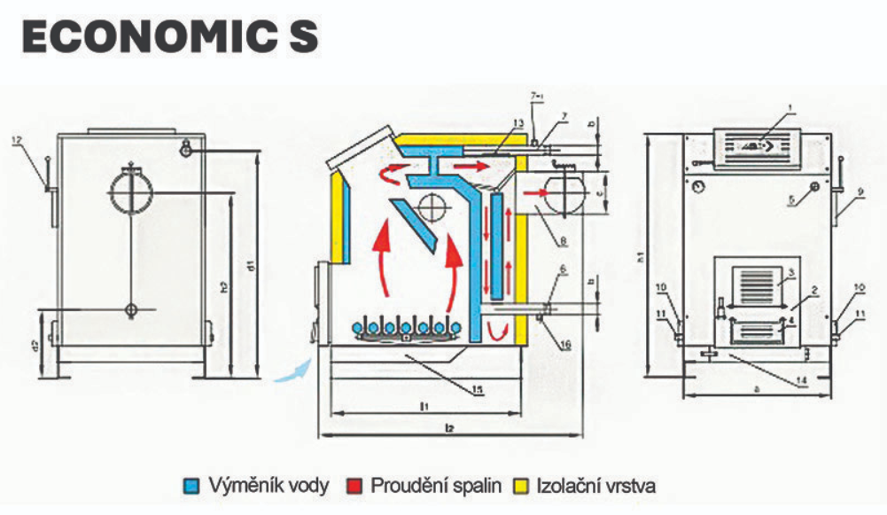 Ocelový kotel Economic s vysokou mírou úspory dostupný ve výkonu 26 kW, ve kterém je možné topit dřevem o délce polen cca 40 cm.