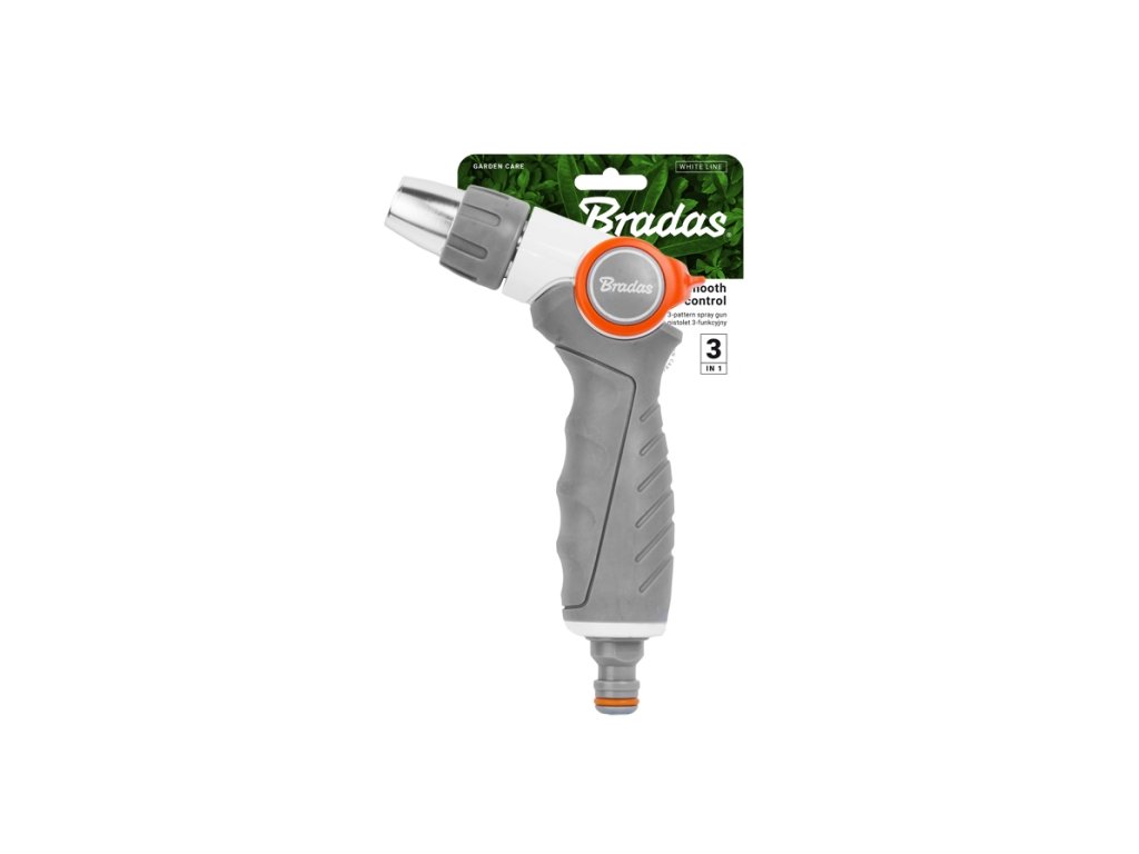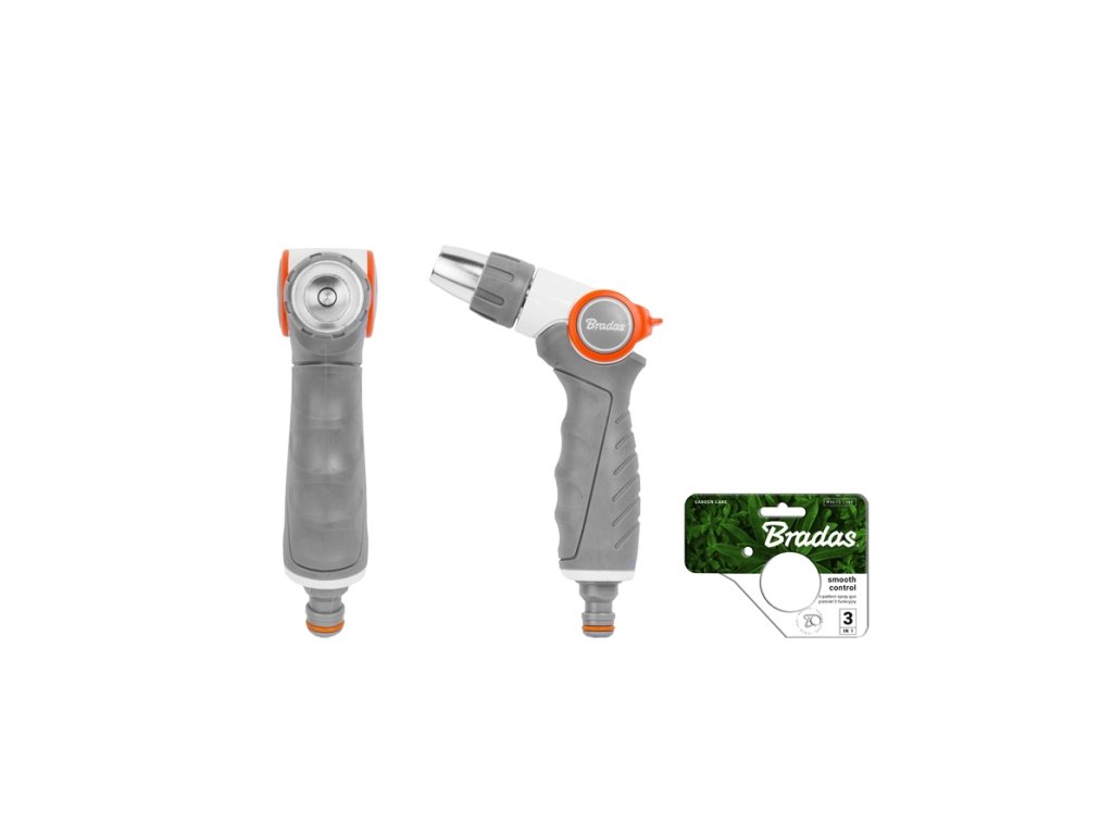 Kovová regulovatelná zavlažovací pistole BRADAS White Line SMOOTH CONTROL s trojí regulací průtoku vody, patentovaným spínačem a regulací přítoku a odtoku vody je nezbytným pomocníkem při práci na zahradě.