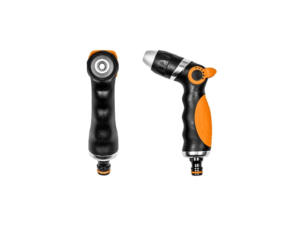 Nastavitelná kovová pistole s adaptérem pro rychlospojku. Ideální pro mytí a jemné zalévání. Široká škála vodních paprsků: od bodového po lehké mrholení. Dva proudy.