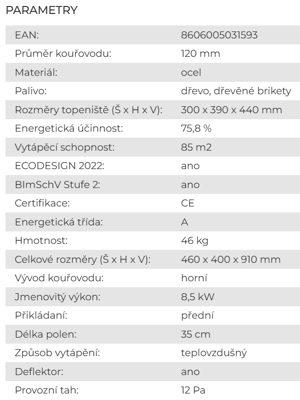 - Sklo dvířek: žáruvzdorné do 750 °C
