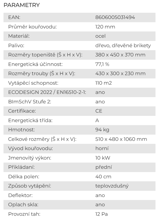- Sklo dvířek : žáruvzdorné do 750 °C
