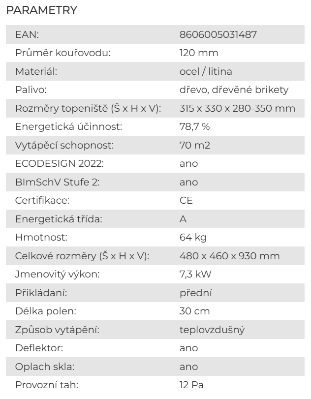 - Sklo dvířek : žáruvzdorné do 750 °C