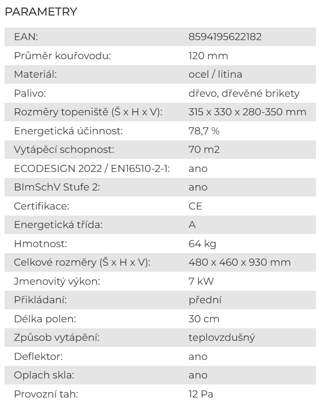 - Sklo dvířek : žáruvzdorné do 750 °C