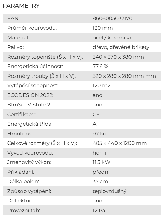 Deflektor kamen šetří palivo a zároveň zvyšuje účinnost kamen. Horní komínový vývod je osazen regulační klapkou.