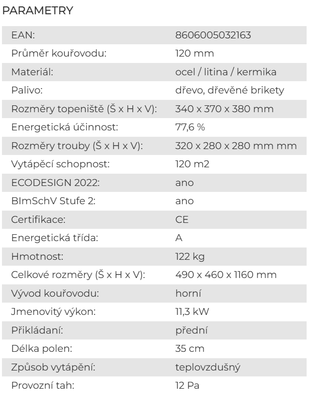 - Sklo dvířek : žáruvzdorné do 750 °C
