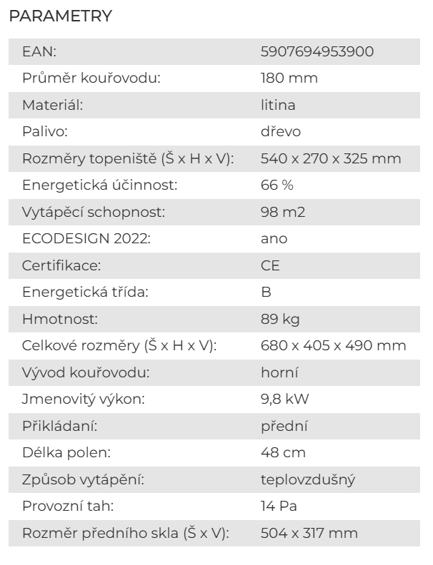 Krbová vložka W9 9,8 kW EKO není určena jako hlavní zdroj vytápění, lze ji instalovat pouze jako doplňkový zdroj energie.