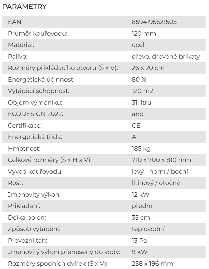 Otěruvzdorná barva chrání povrch a zvyšuje odolnost proti poškrábání. Dvířka topeniště jsou vybavena žáruvzdorným sklem vysoké kvality, které umožňuje pohled na plameny a zároveň zajišťuje bezpečnost. V přední části kamen se nachází teploměr a tlakoměr, díky kterému je možné monitorovat provozní podmínky.