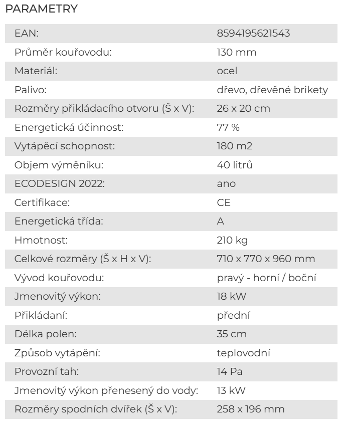 Otěruvzdorná barva chrání povrch a zvyšuje odolnost proti poškrábání. Dvířka topeniště jsou vybavena žáruvzdorným sklem vysoké kvality, které umožňuje pohled na plameny a zároveň zajišťuje bezpečnost. V přední části kamen se nachází teploměr a tlakoměr, díky kterému je možné monitorovat provozní podmínky.