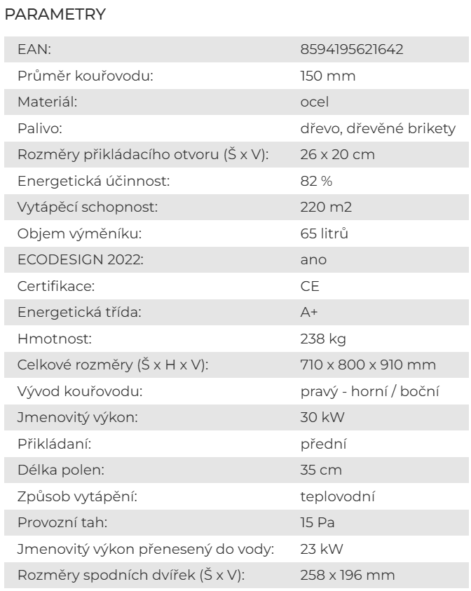 Otěruvzdorná barva chrání povrch a zvyšuje odolnost proti poškrábání. Dvířka topeniště jsou vybavena žáruvzdorným sklem vysoké kvality, které umožňuje pohled na plameny a zároveň zajišťuje bezpečnost. V přední části kamen se nachází teploměr a tlakoměr, díky kterému je možné monitorovat provozní podmínky.