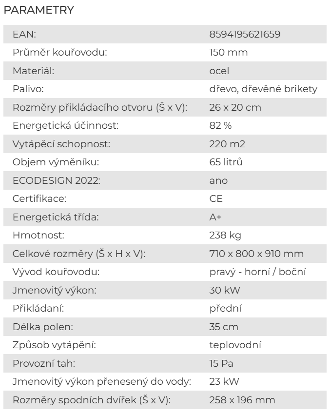 Otěruvzdorná barva chrání povrch a zvyšuje odolnost proti poškrábání. Dvířka topeniště jsou vybavena žáruvzdorným sklem vysoké kvality, které umožňuje pohled na plameny a zároveň zajišťuje bezpečnost. V přední části kamen se nachází teploměr a tlakoměr, díky kterému je možné monitorovat provozní podmínky.