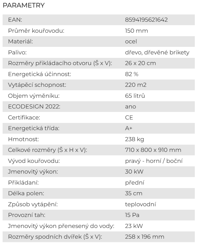 Otěruvzdorná barva chrání povrch a zvyšuje odolnost proti poškrábání. Dvířka topeniště jsou vybavena žáruvzdorným sklem vysoké kvality, které umožňuje pohled na plameny a zároveň zajišťuje bezpečnost. V přední části kamen se nachází teploměr a tlakoměr, díky kterému je možné monitorovat provozní podmínky.