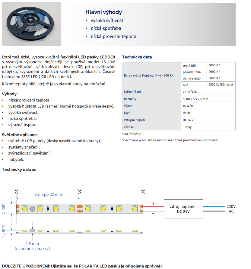 LED pásek optimalizovaný pro maximální svítivost LGP panelů - výrazně nižší teplota než při použití pásku 12V; vyšší hustota LED čipů zamezuje tvorbě hot-spotů na kraji desky. Vysoká svítivost. Šíře pásku 5mm, aby bylo možno použít do profilů pro LGP panely! Tech. info: 24 V, 15 W/m, 120 LED/m, teplá bílá - 3000K. Pásek navíc obsahuje distanční podložky, aby plexi neleželo přímo na čipech. Balení klubko 5m, dodáváme po celých metrech (uvedená cena platí pro 1bm).