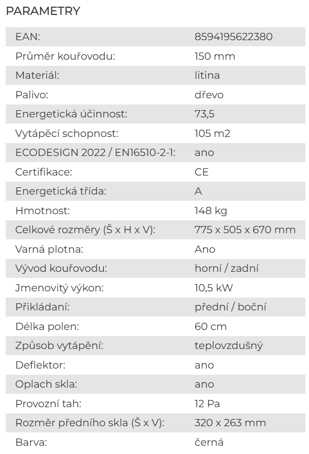 Masivní krbová kamna z šedé litiny s výkonem 10,5 kW pro vytápění obytných prostor do velikosti až 263 m3 . Prostorné tělo kamen je umocněno velkým oknem a dvěmi bočními okny. Vstup do topeniště je nejen předními dvířky, ale je navíc doplněn o možnost bočního přikládání velkých polen.