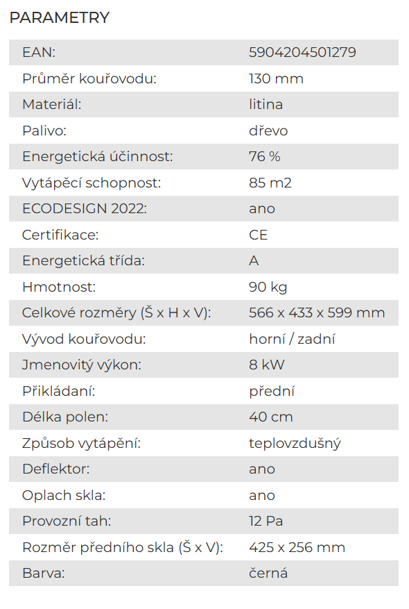 Prostorný vstup dvířky do topeniště disponuje bezpečným tzv. chladným zavíráním. Do topeniště je možné použít polena o rozměru až 40 cm.