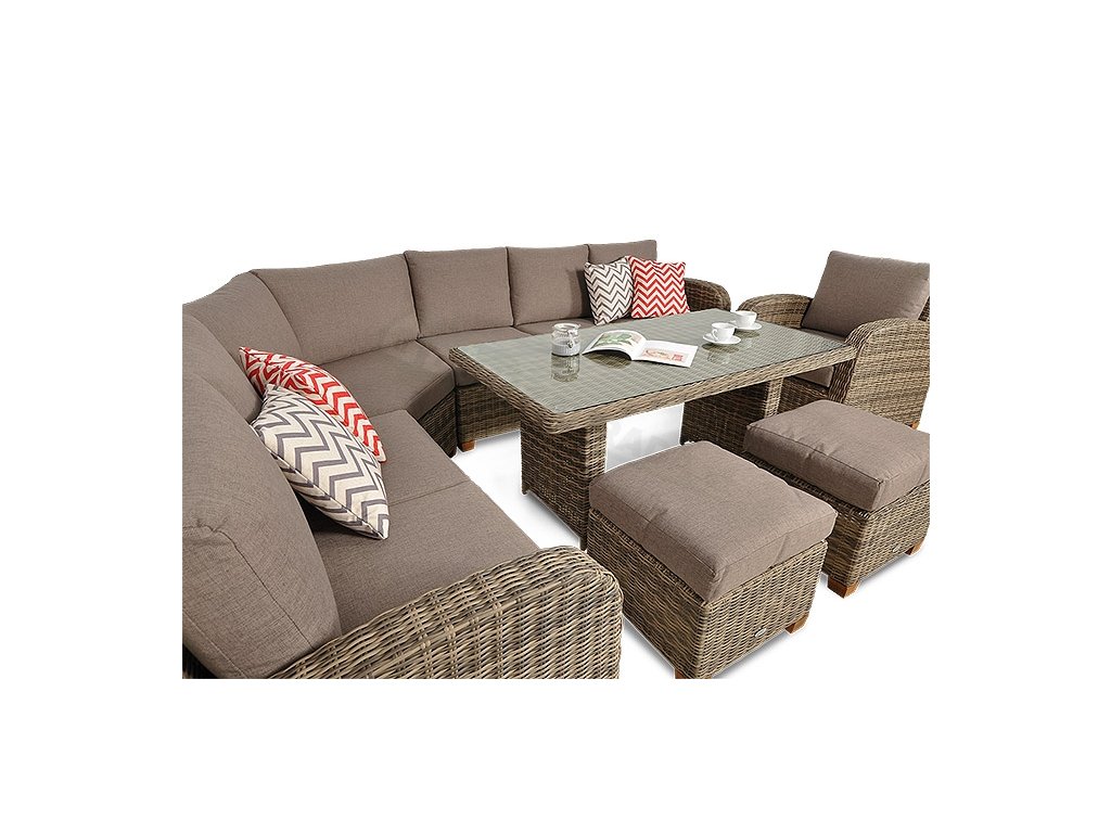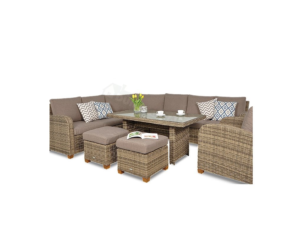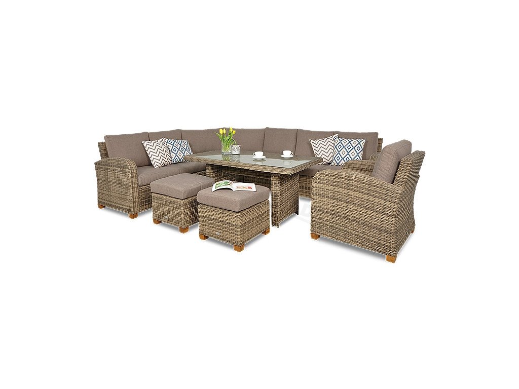 Prostorná sedací souprava Moniz Caffe je tvořena 3 segmenty s aluminiovou konstrukcí a kvalitním technoratanovým výpletem v příjemných odstínem hnědé barvy. V kompletu se pohodlně usadí až 6 osob.