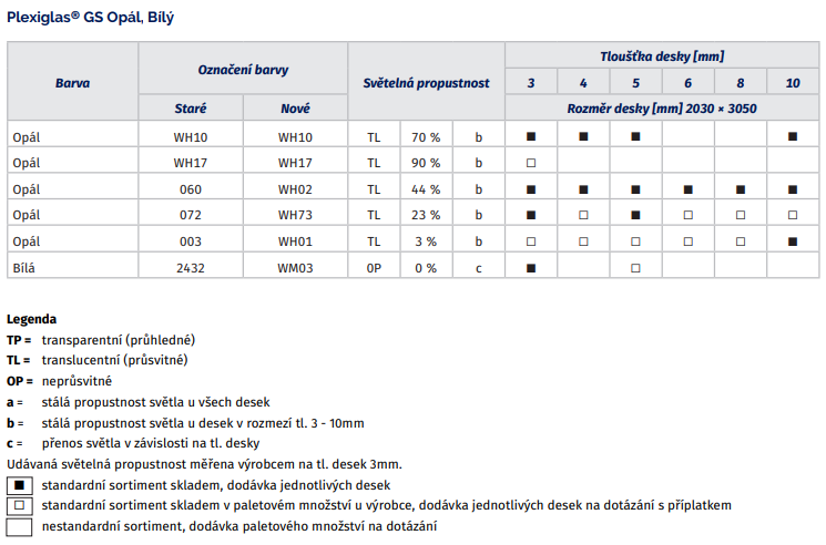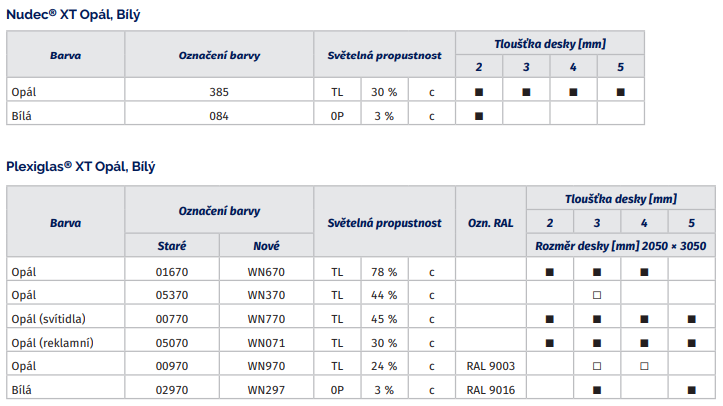 Sytě bílé akrylátové desky Nudec XT-084 s propustností světla 3% v tloušťce 2 mm.