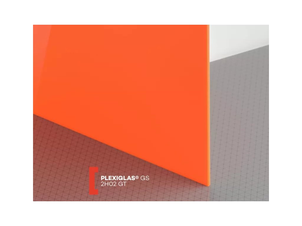 Lité neprůhledné (průsvitné) oranžové plexisklo tloušťky 3 mm Plexiglas GS 2H02 s propustností světla cca 6%. Jedná se o velmi kvalitní druh plexiskla, materiál je vysoce odolný proti UV záření a povětrnostním vlivům. Obě povrchové strany těchto desek z plexiskla jsou hladké a vysoce lesklé, dodávané s ochrannou folií. Široké použití v reklamě, stavebnictví a průmyslu. Výroba litím znamená, že materiál se naleje mezi dvě skleněné desky a v peci postupně chládne. Tímto získává menší vnitřní pnutí, avšak větší tloušťkovou toleranci než extrudované plexisklo.