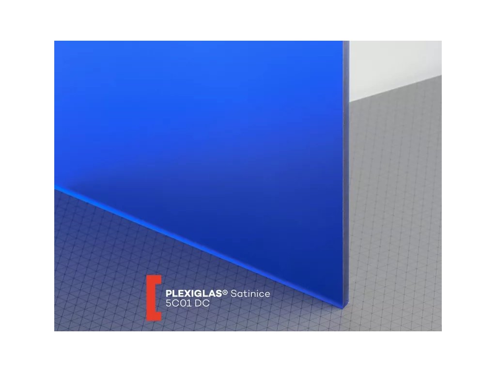 5C01 DC je nebesky modré průsvitné oboustranně pískované plexisklo značky Plexiglas SATINICE v tloušťce 6 mm s propustností světla cca 5%. Desky jsou určené mj. pro nasvětlení s optimálním rozptylem světla. Materiál je UV-nepropustný, vysoce odolný proti UV záření a povětrnostním vlivům, poskytujeme 10-letou záruku na stálost fyzikálních vlastností. Obě povrchové strany těchto desek z plexiskla jsou kryty ochrannou folií. Široké použití v reklamě, nábytkářství, designu... K tomuto typu desek dodáváme speciální lepidlo Acrifix 195, které po zaschnutí není lesklé, ale vytváří dojem opískování.