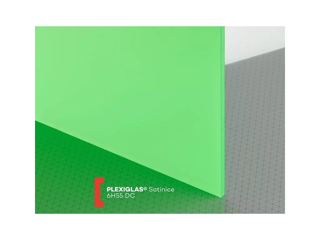 6H55 DC je trávově zelné průsvitné oboustranně pískované plexisklo značky Plexiglas SATINICE v tloušťce 6 mm s propustností světla cca 46%.