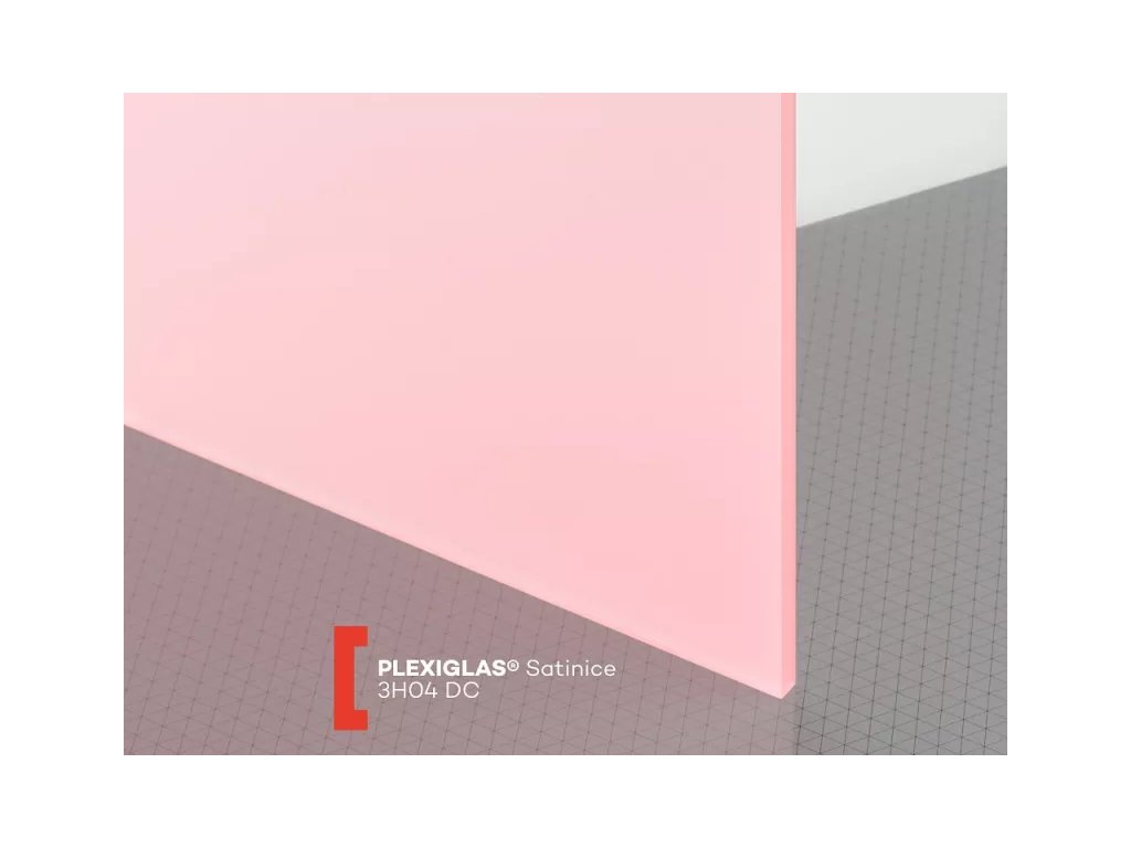 3H04 DC je melounově červené (až růžové) průsvitné oboustranně pískované plexisklo značky Plexiglas SATINICE v tloušťce 6 mm s propustností světla cca 52%. Desky jsou určené mj. pro nasvětlení s optimálním rozptylem světla. Materiál je UV-nepropustný, vysoce odolný proti UV záření a povětrnostním vlivům, poskytujeme 10-letou záruku na stálost fyzikálních vlastností. Obě povrchové strany těchto desek z plexiskla jsou kryty ochrannou folií. Široké použití v reklamě, nábytkářství, designu... K tomuto typu desek dodáváme speciální lepidlo Acrifix 195, které po zaschnutí není lesklé, ale vytváří dojem opískování.