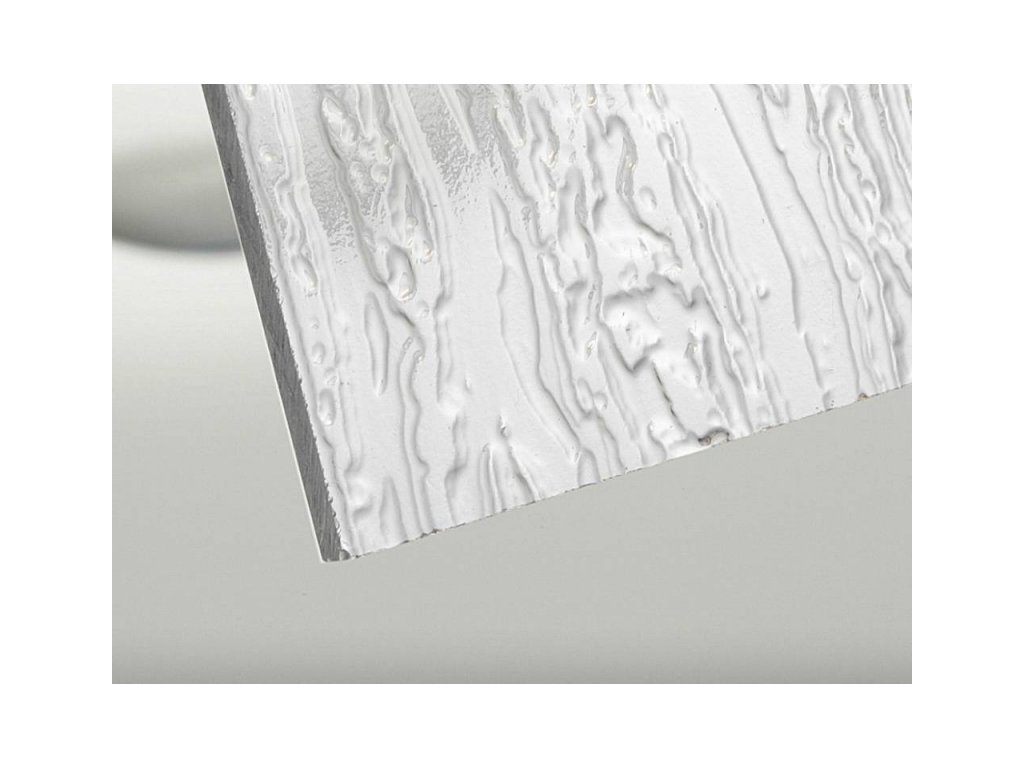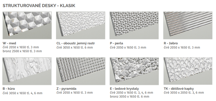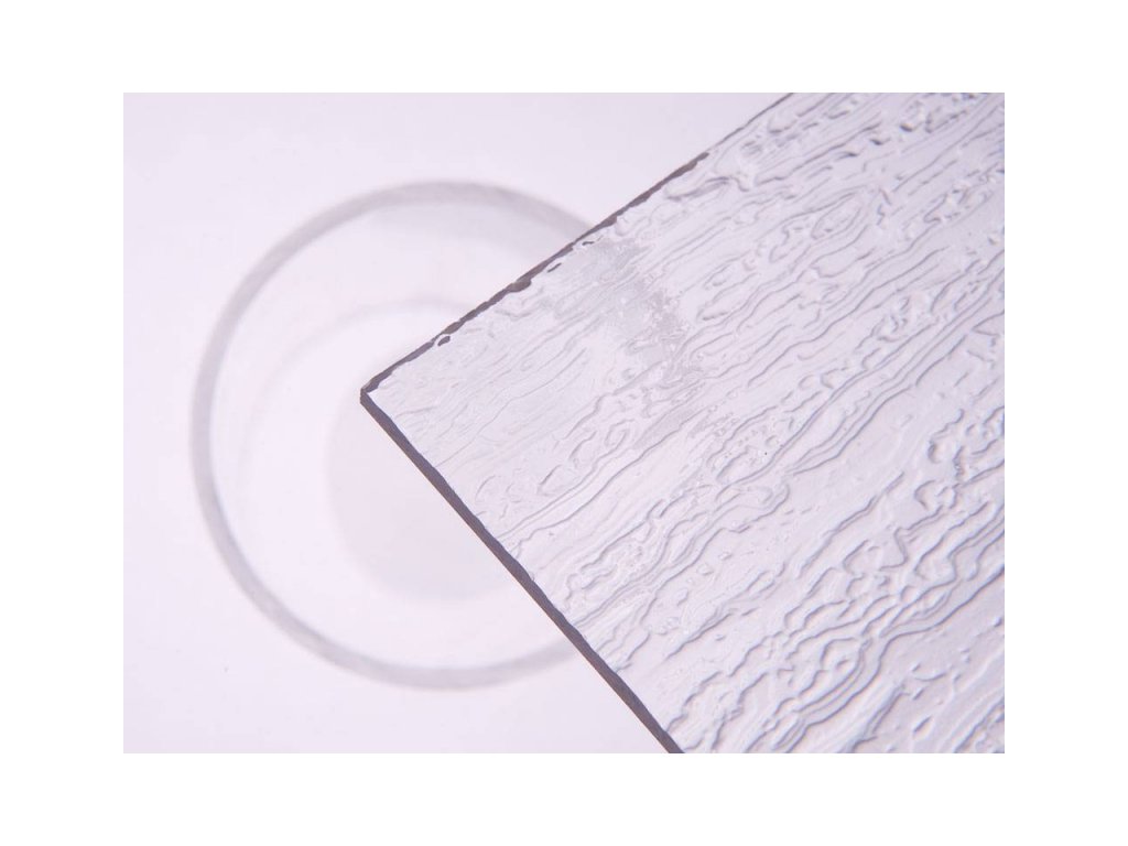 Plexisklo desky se strukturovaným povrchem připomínajícím kůru stromu. Materiál vhodný pro zasklení balkonů, dělící příčky, oddělování sprch, součásti nábytku, prosklení dveří. Schválené jako bezpečnostní prosklení, výborná odolnost proti povětrnostním vlivům a proti stárnutí, lehké a nelámavé, odolné vůči nárazu. Snadné opracování a montáž.