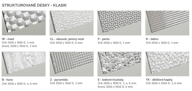 Plexisklo desky se strukturovaným povrchem připomínajícím ledové krystaly. Materiál vhodný pro zasklení balkonů, dělící příčky, oddělování sprch, součásti nábytku, prosklení dveří. Schválené jako bezpečnostní prosklení, výborná odolnost proti povětrnostním vlivům a proti stárnutí, lehké a nelámavé, odolné vůči nárazu. Snadné opracování a montáž.
