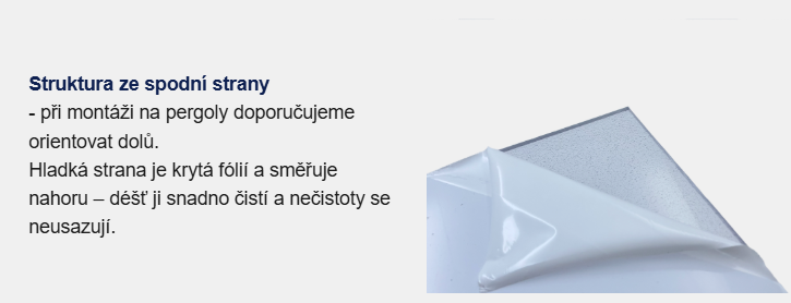 - Strukturovaný povrch – z jedné strany jemná struktura, kterou při montáži pergoly doporučujeme orientovat dolů. Hladká strana je krytá fólií a směřuje nahoru – déšť ji snadno čistí a nečistoty se neusazují.