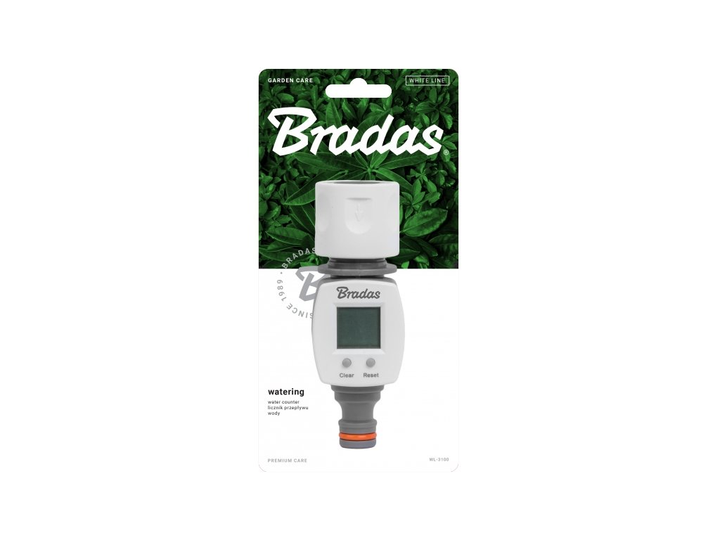 Digitální počitadlo průtoku vody. Počítadlo je osazené rychlospojkou pro snadné napojení na přívod vody nebo zahradní hadici.