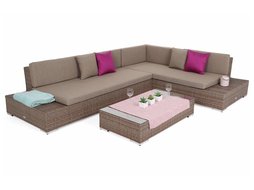 Moderní zahradní rohová sedačka v nadčasové a minimalistické podobě je vyrobena z velmi pevných materiálů: hliník a technorat. Tyto materiály jsou mechanicky extrémně odolné a zároveň odolné vůči nepříznivým povětrnostním vlivům. Hliníková konstrukce byla navíc opatřena práškovým povlakem, který ji chrání proti oděru nebo poškrábání. Nábytek se skládá ze dvou rohových částí a nízkého stolu s tvrzeným sklem. Pohodlné polstrované polštáře jsou doplněny zipy pro možnost snadného sejmutí a vyčištění.