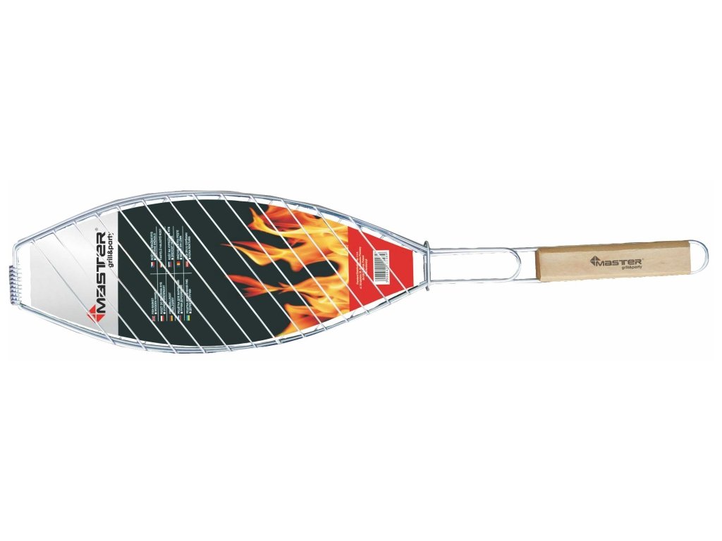Rošt z chromované oceli pro grilování ryb různých velikostí. Dřevěná rukojeť pro snadnou manipulaci při přípravě grilovaných ryb.