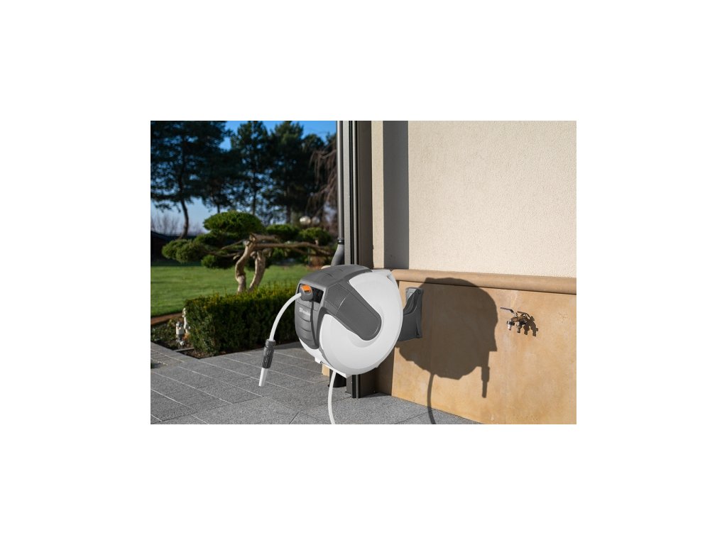 Závěsný hadicový naviják pro upevnění na stěnu. Pohodlné navíjení zpět do úschovného bubnu s blokací při vysunutí požadované délky. Flexibilní manipulaci při zavlažování umožňuje držák s možností otáčení o 180 st.